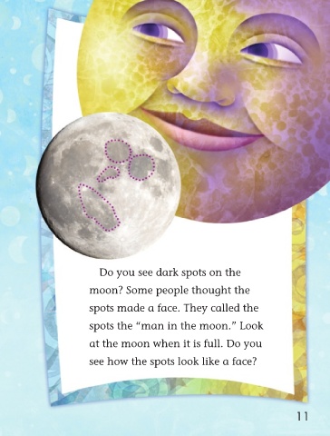 Do you see dark spots on the moon? Some people thought the spots made a face. They called the spots the “man in the moon.” Look at the moon when it is full. Do you see how the spots look like a face? 11