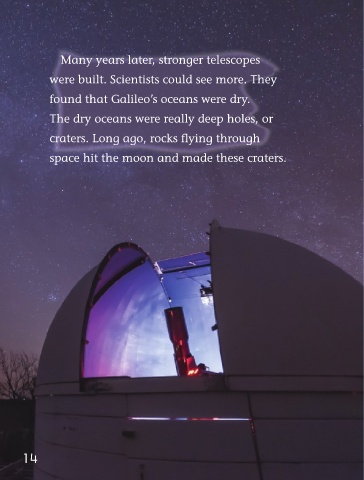 Many years later, stronger telescopes were built. Scientists could see more. They found that Galileo’s oceans were dry. The dry oceans were really deep holes, or craters. Long ago, rocks flying through space hit the moon and made these craters. 14
