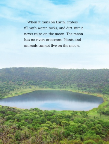 When it rains on Earth, craters fill with water, rocks, and dirt. But it never rains on the moon. The moon has no rivers or oceans. Plants and animals cannot live on the moon. 16