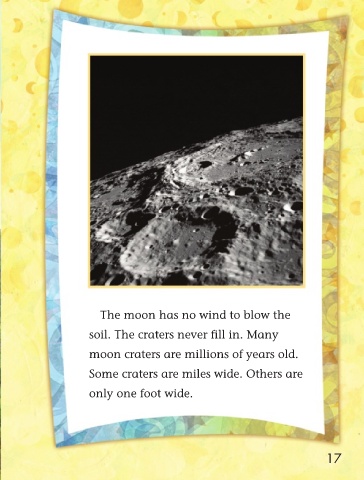 The moon has no wind to blow the soil. The craters never fill in. Many moon craters are millions of years old. Some craters are miles wide. Others are only one foot wide. 17
