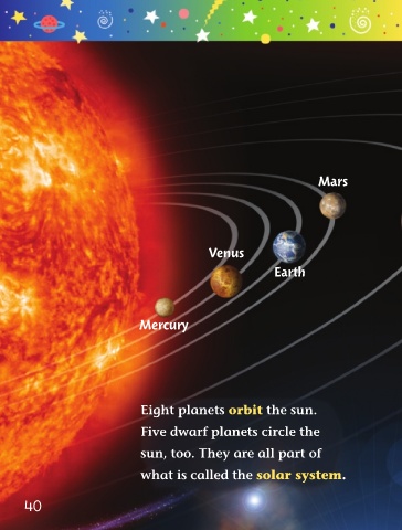 Mars Venus Earth Mercury Eight planets orbit the sun. Five dwarf planets circle the sun, too. They are all part of what is called the solar system. 40