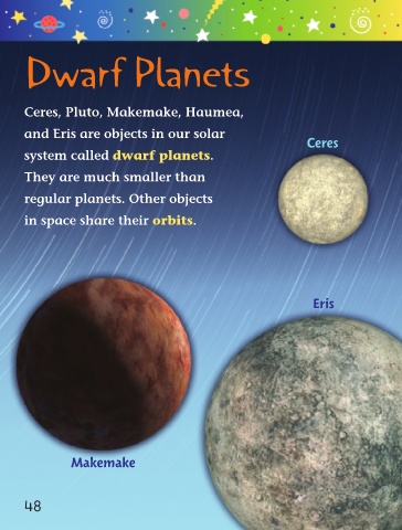Dwarf Planets Ceres, Pluto, Makemake, Haumea, and Eris are objects in our solar Ceres system called dwarf planets. They are much smaller than regular planets. Other objects in space share their orbits. Eris Makemake 48